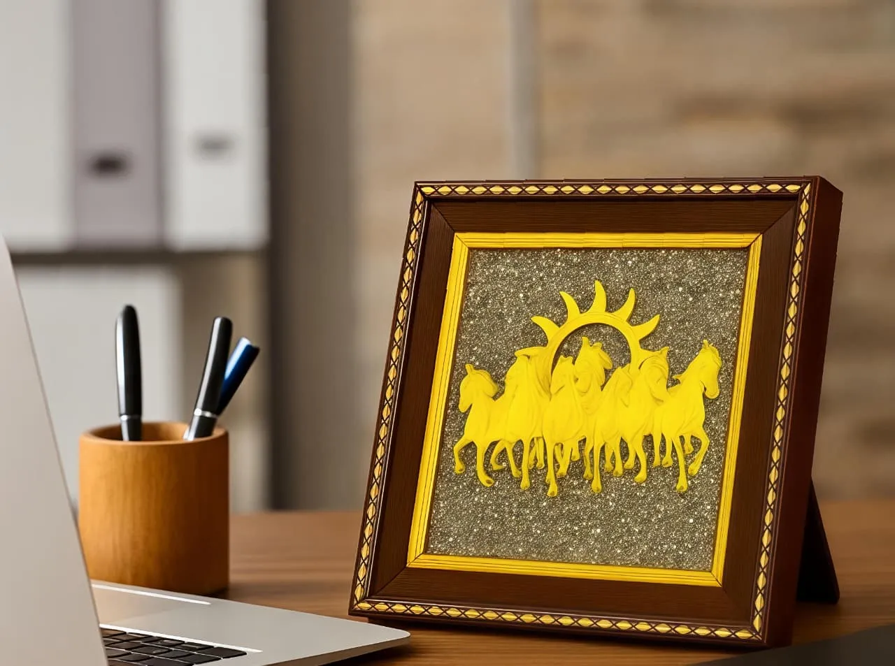 Bring home success, positivity, and prosperity with this handcrafted 7 Horses on Raw Pyrite Frame by Dhumra Gems. Made with natural raw pyrite stone and golden running horses with a rising sun, this compact 19cm x 19cm décor frame is perfect for home, office, gifting, and Vastu use. Each piece is unique due to natural pyrite texture.